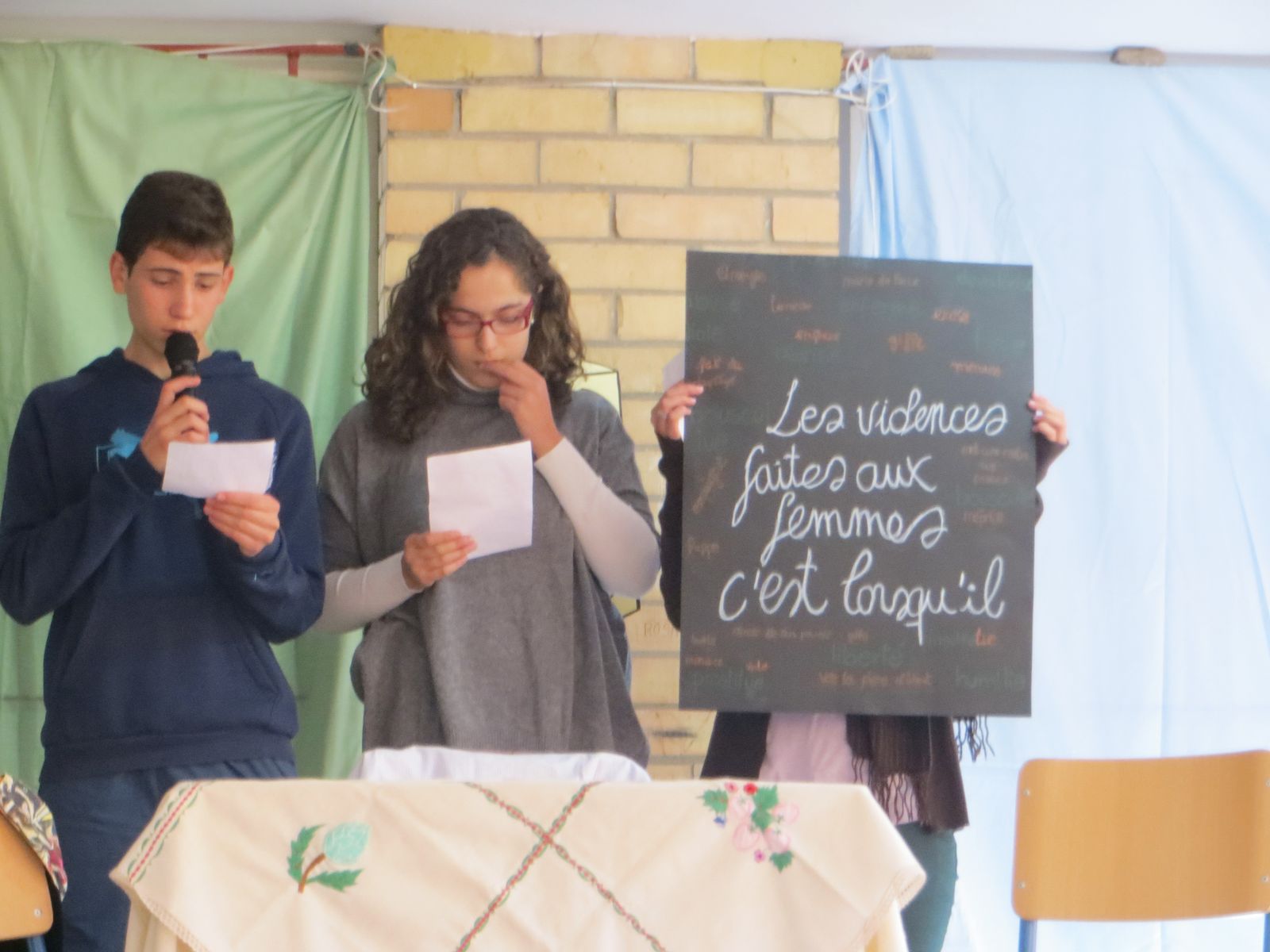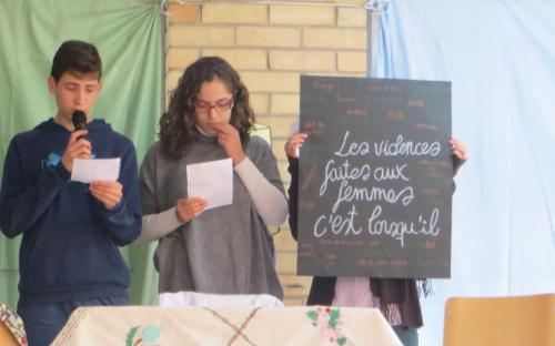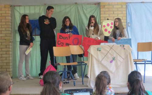 A continuación llevamos a cabo la actividad “Se puede decir en diferentes idiomas pero siempre significará lo mismo: No a la Violencia.” Asi los alumnos leyeron una serie de reflexiones, frases y poemas en castellano, inglés y francés, relacionadas con la violencia machista. Estos carteles fueron posteriormente distribuidos por todo el instituto.