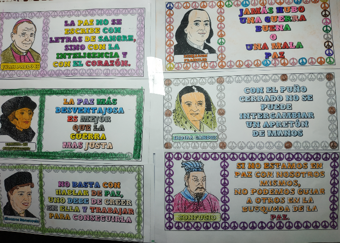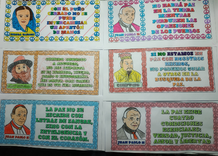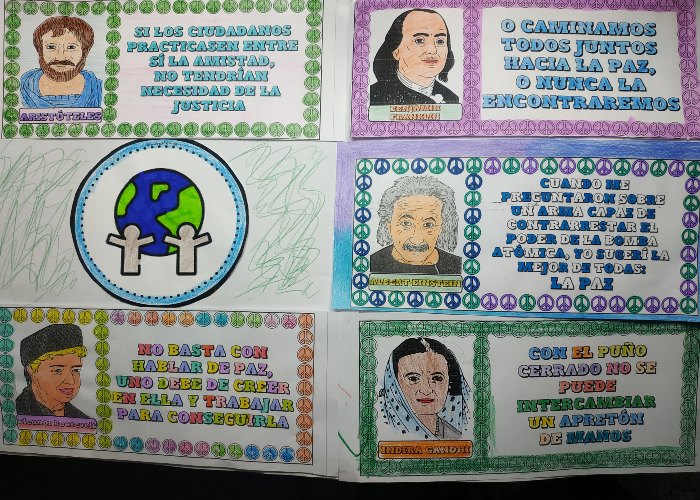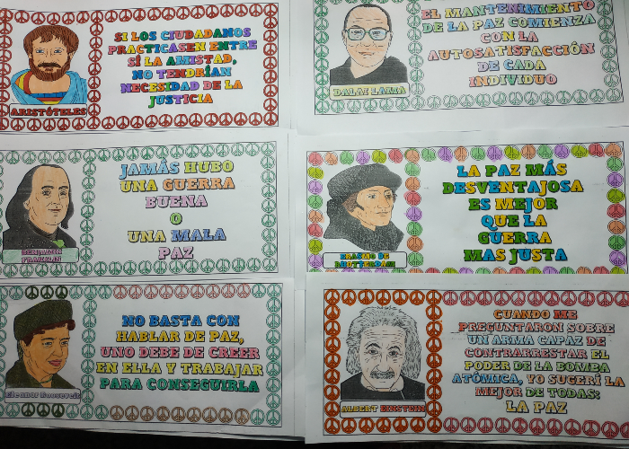 Desde clase elaboramos un manifiesto por la paz y por el fin en todos los conflictos bélicos del mundo, no solo de Europa. Aunque tenemos que reconocer que, por tratarse de nuestro continente, muy especialmente nos sentimos angustiados-as por tanta gente sufriendo en Ucrania, de la que tenemos multitud de imágenes en los medios de comunicación, redes sociales... y vemos tanta destrucción, tantos-as refugiados-as y a la vez miles de imágenes de solidaridad, de ayuda y esperanza en que vuelva pronto la PAZ, una palabra monosílaba pero de un alcance infinito. Hemos reflexionado sobre personajes de la historia y sus mensajes de paz y hemos coloreado cada frase para acabar simbólicamente con el gris y el negro de tanta pesadilla.